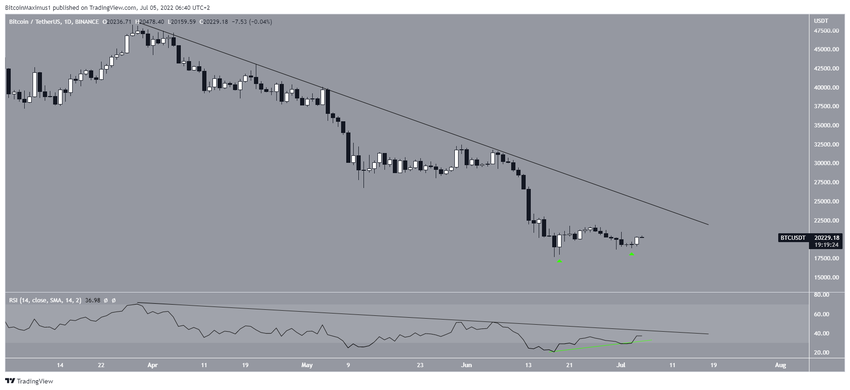 Le cours de Bitcoin décline sous une ligne de résistance descendante depuis le 5 avril. Cette ligne a récemment engendré un rejet du cours, ce le 7 juin (flèche rouge), menant à un creux de 17 622 $ atteint le 18 juin.