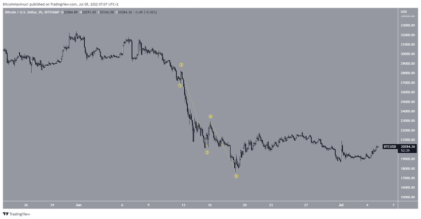 Le deuxième décompte suggère également qu’un mouvement baissier en cinq vagues est terminé. Cependant, au lieu d’être tronqué, ce décompte commence au précédent sommet inférieur du BTC.