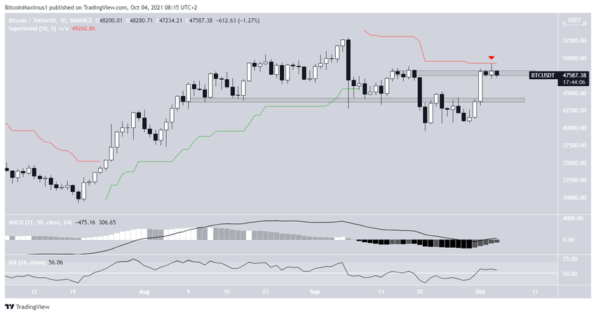 Le BTC fait face à une résistance située à 47 850 $. Il s’agit d’une zone horizontale, qui coïncide également avec la ligne journalière de la supertendance (flèche rouge). Si le cours parvient à dépasser cette zone, il pourrait monter vers de nouveaux sommets.