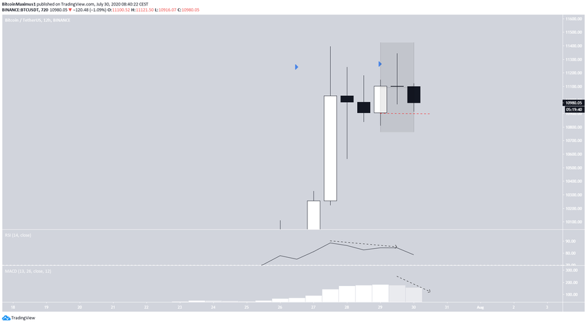 De plus, les trois derniers chandeliers sur 12 heures sont en train de former un schéma en étoile du soir, lequel se complèterait par une clôture sous les 10 900$.
