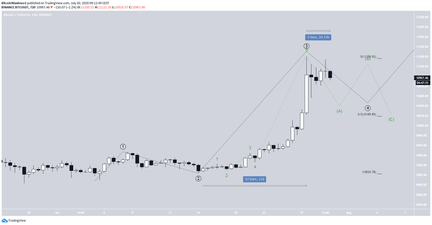 Le mouvement ascendant a duré 11 jours, et la correction se trouve actuellement à son deuxième jour. Lorsqu’il aura complété cette correction, le BTC devrait monter vers un sommet supérieur afin de compléter sa cinquième vague.