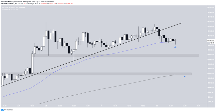 Le graphique à l’heure montre que le cours est déjà passé sous une ligne de support ascendante. Lors de la publication de cet article, le BTC s’échangeait au-dessus de la moyenne mobile (MA) à 50 heures, laquelle lui fournit un support depuis le début du mouvement ascendant.
