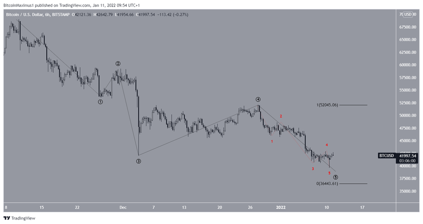 Dans le cas d’une possible extension de cette sous-vague, au sein de laquelle les vagues 1 et 5 présentent un ratio de 1:1, le BTC descendrait jusqu’à 36 450 $ avant de rebondir.