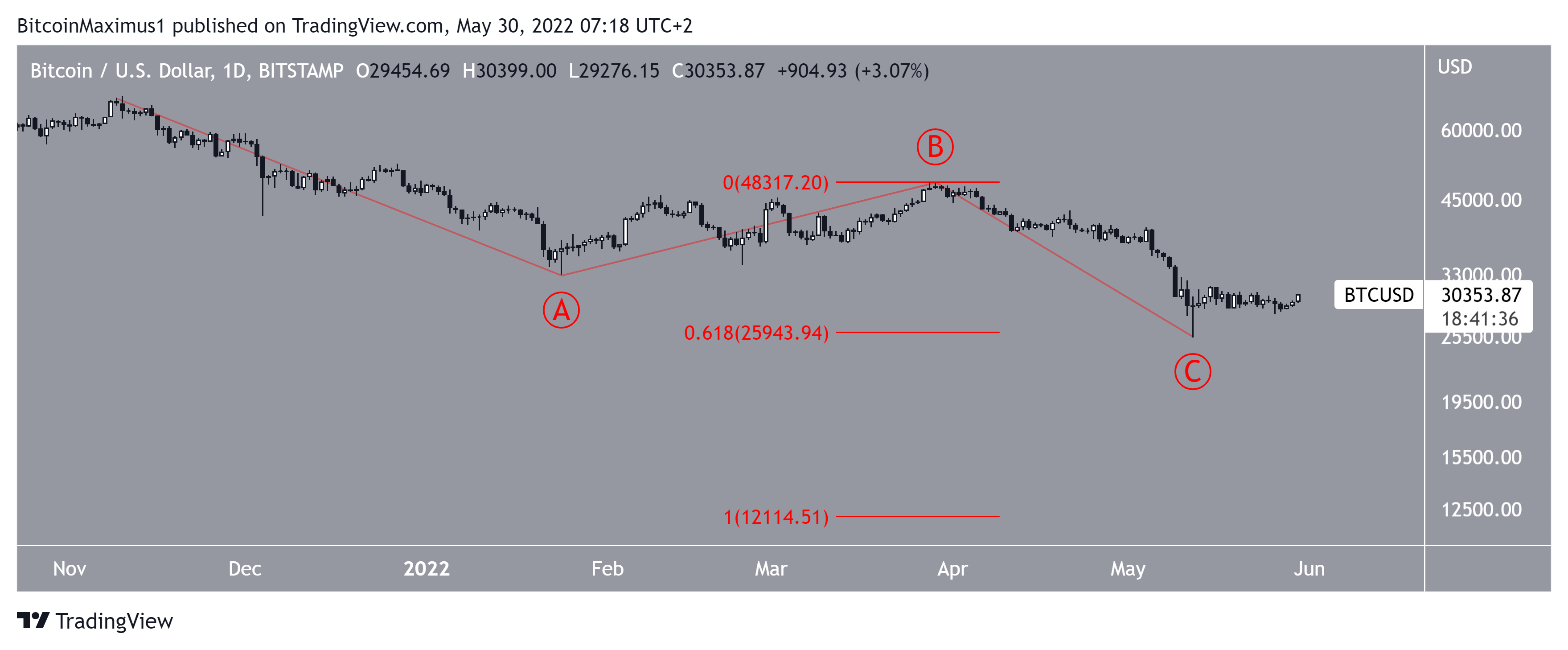 Les perspectives du graphique journalier suggèrent que BTC vient peut-être de terminer la vague C d’une structure corrective A-B-C (rouge). Dans ce document, les vagues A et C ont eu un rapport de 1: 0,618, ce qui est courant dans de telles structures.