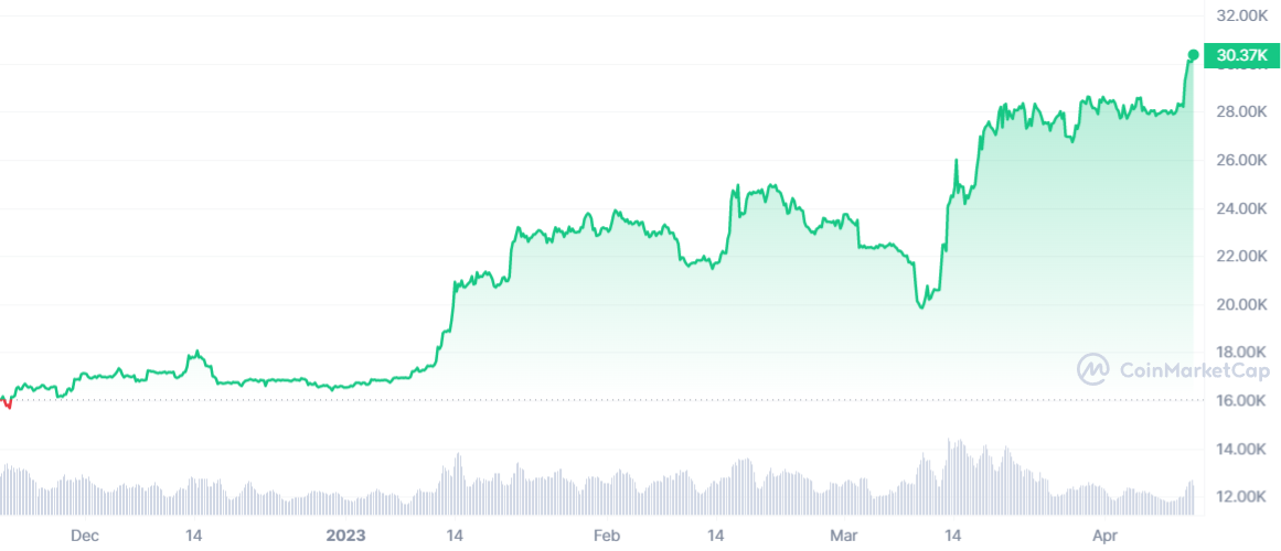 Cependant, des investisseurs ont su saisir les opportunités et alors que le cours 🚀 Bitcoin vient tout juste de franchir la barre des 30 000 $, l’actif est en hausse de 82 % depuis le 1er janvier. Par rapport au prix de la fin novembre, il s’agit presque d’une hausse de 100 % de la part de la première cryptomonnaie en termes de market cap.