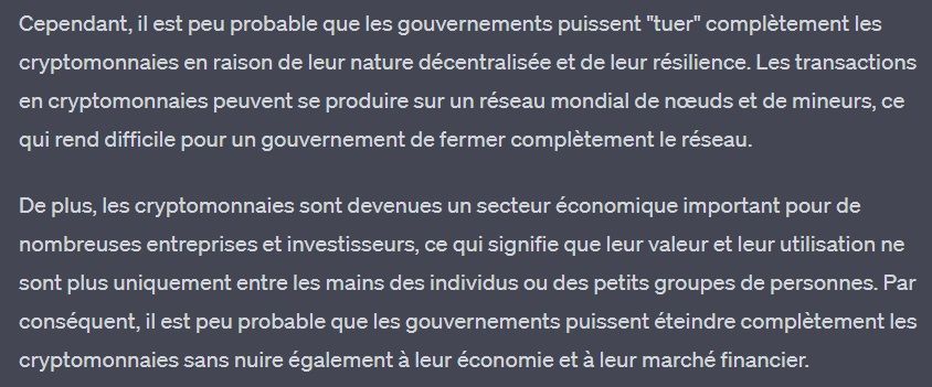 ChatGPT continue de livrer son verdict et sa vérité ! Après avoir été interrogé sur 🪙 l’adoption des cryptomonnaies ou encore sur 👤 l’identité du très mystérieux Satoshi Nakamoto, l’IA s’est prononcée sur la survie des cryptomonnaies. Alors, le gouvernement peut-il tuer Bitcoin et la crypto ?