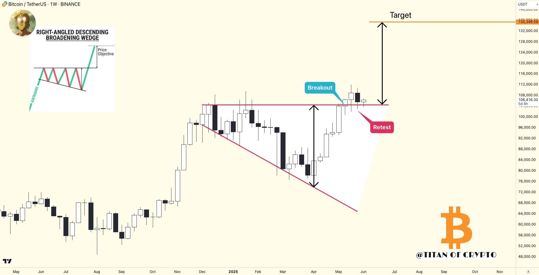 L’analyse chartiste à moyen terme confirme la présence d’une figure classique pour le Bitcoin : une « figure en coin descendant élargi à angle droit », récemment cassé à la hausse, ce qui constitue un signal haussier puissant. Selon Titan of Crypto, tant que le prix se maintient au-dessus de la zone de breakout (environ 104 000 $ – 107 000 $), un objectif de prix à 135 000 $ devient parfaitement crédible.