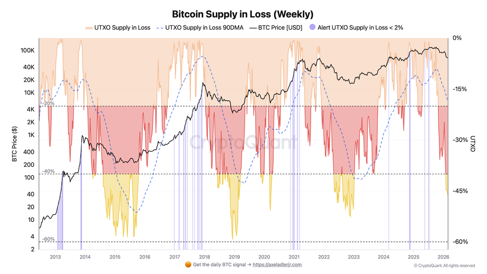 Près de 46,3 % de l’offre totale de Bitcoin se trouve actuellement en perte, un niveau historiquement observé lors des phases de stress extrême. Si ce ratio dépasse à nouveau les 60 %, cela pourrait marquer, comme par le passé, la fin d’un cycle baissier.