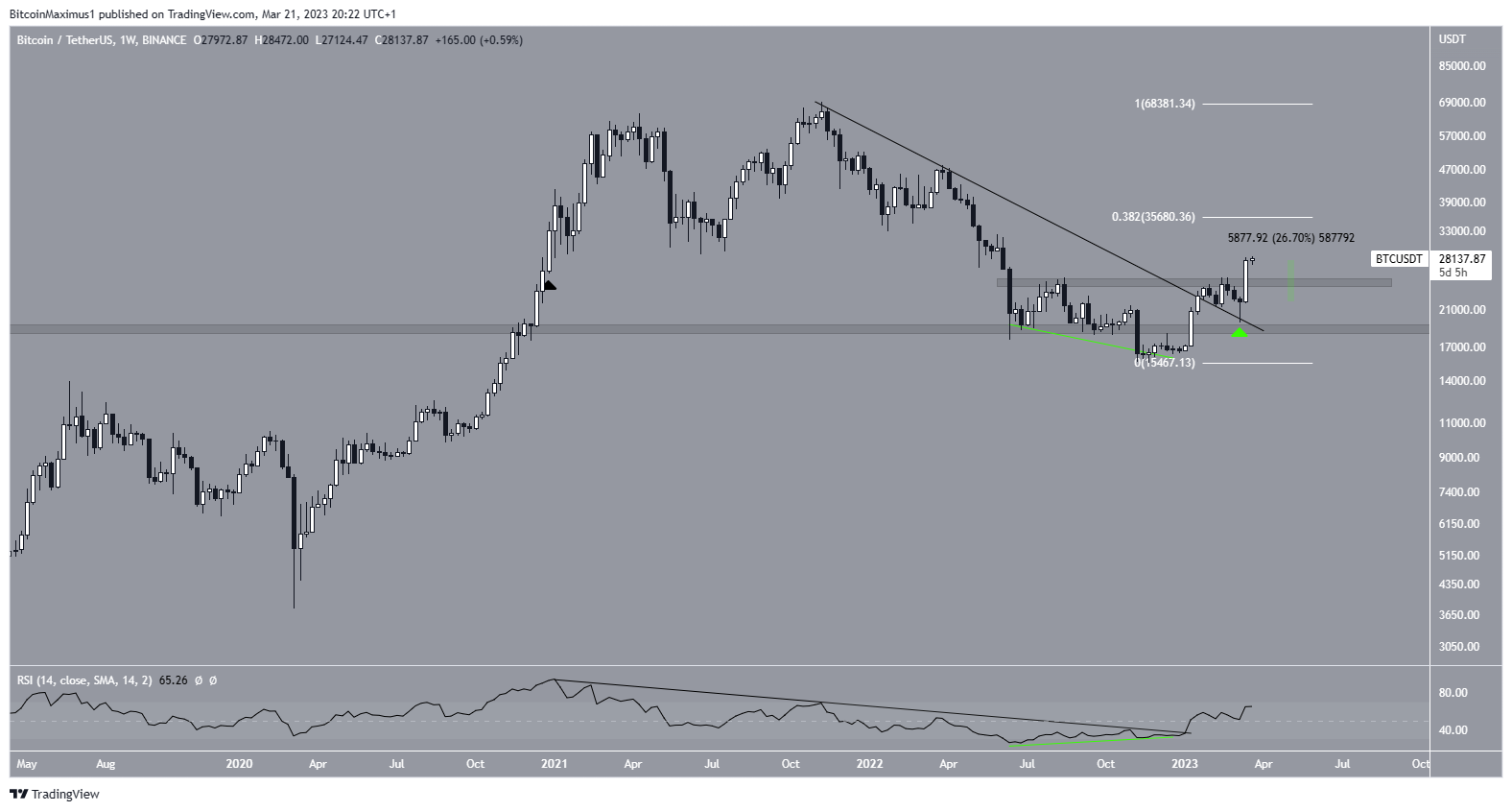Les données hebdomadaires du BTC nous montrent que le cours décline sous une ligne de résistance descendante depuis son sommet record de 69 000 $ atteint en novembre 2021. Le mouvement de déclin a culminé avec un creux de 15 476 $ atteint en novembre de l’année suivante.