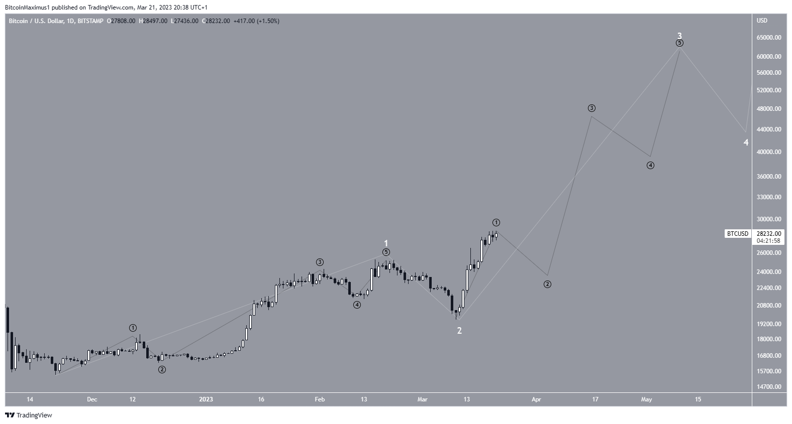 On trouve deux décomptes de vagues possibles pour la tendance future de Bitcoin. Le premier suggère que le cours se trouve dans la cinquième et dernière vague de sa hausse. Au-delà du niveau externe 1,61 de Fibonacci (en blanc), la prochaine résistance de taille se trouve à 32 000 $ ; ainsi, la vague cinq présenterait la longueur combinée des vagues un et trois. S’il s’agit du décompte correct, un déclin de taille aurait ensuite lieu.