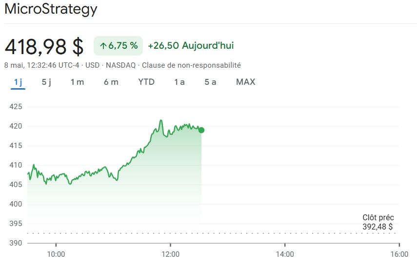 La plus grande crypto au monde a dépassé les 100 000 $ et le cours du MSTR a quant à lui dépassé nettement les 400 $.