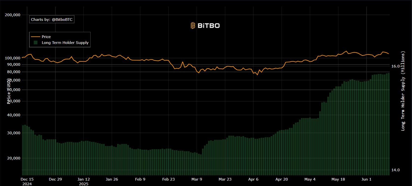 Entre mars et juin 2025, plus de 1,6 millions de BTC ont été ajoutés à cette supply, avec désormais 15,9 millions de jetons détenus sans le moindre transfert depuis plus de 155 jours. Et si l’accumulation a été particulièrement forte en mai, elle est toujours d’actualité en juin.