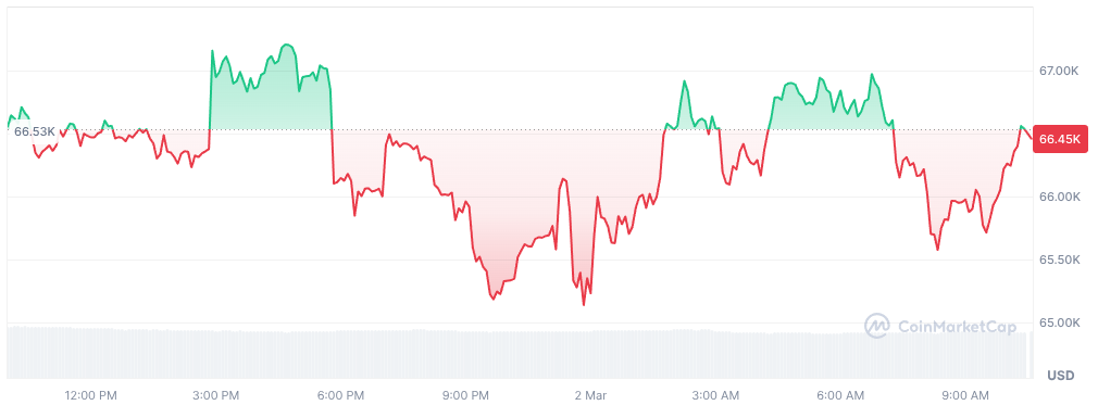 Le cours du BTC a légèrement reculé pour se stabiliser autour de 66 000 $, suite à l’escalade des frappes américano-israéliennes contre l’Iran et à la rumeur de la mort de l’ayatollah Ali Khamenei. Les actions asiatiques ont chuté tandis que les prix du pétrole ont bondi, mais le marché crypto a réagi modérément, avec une volatilité inférieure aux marchés traditionnels et une stabilisation rapide grâce à sa liquidité 24/7.