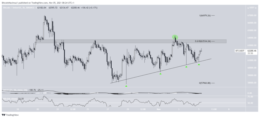 Sur le graphique ci-dessous, on voit que le cours du BTC suit une ligne de support ascendante, mais qu’il a également été rejeté par la résistance située à 63 500 USD. Si Bitcoin dépasse cette zone, cela signifie que la tendance à court terme est haussière. Toutefois, si le cours chute en-dessous de sa ligne de support, nous assisterons probablement à une correction du BTC.