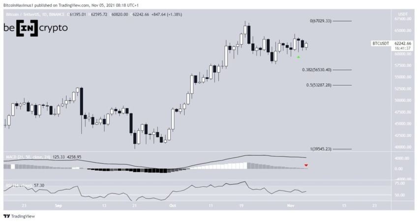 Le 3 novembre 2021, le cours de Bitcoin a rebondi à un niveau de résistance clé. La bougie quotidienne présente une grande et longue mèche, indiquant que la pression d’achat était forte ce jour-là. Cependant, le BTC a fortement chuté le lendemain, son prix de clôture quotidien étant nettement inférieur à celui d’ouverture du même jour, ainsi qu’au prix de clôture du 3 novembre. La tendance du cours semble donc baissière.