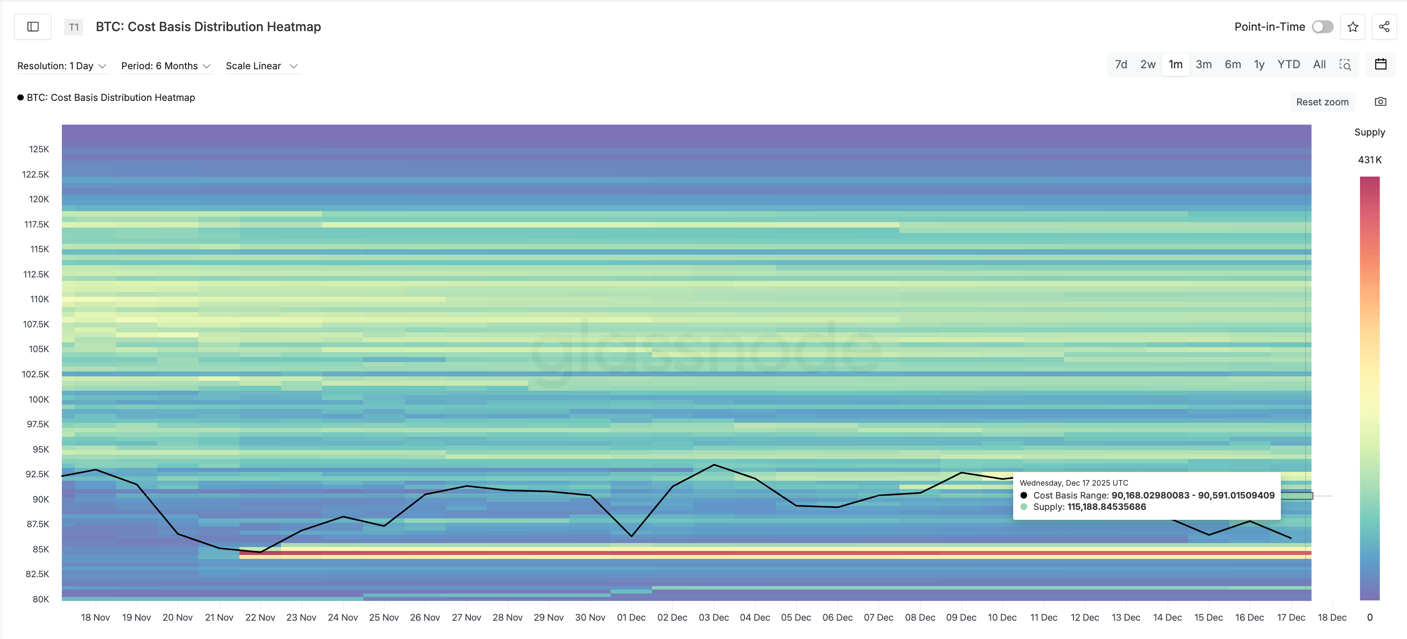 Les données on-chain identifient deux zones clés dans cette correction : une résistance majeure entre 90 168 $ et 90 591 $, où plus de 115 000 BTC avaient été achetés et revendus dès leur retour à l’équilibre, ainsi qu’un fort support compris entre 84 845 $ et 85 243 $, qui a stoppé la descente.