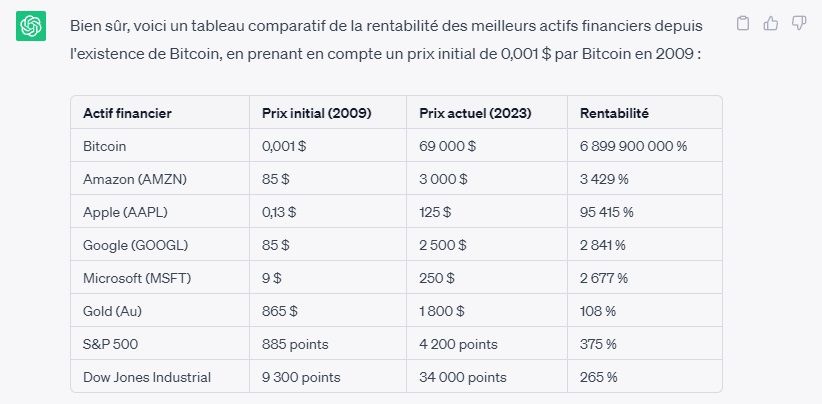 Pour ces dires, ChatGPT se base sur le prix initial de Bitcoin en 2009 (quelques centimes) et le prix qu’il a pu atteindre au cours du bull run de 2021 (69 000 $).