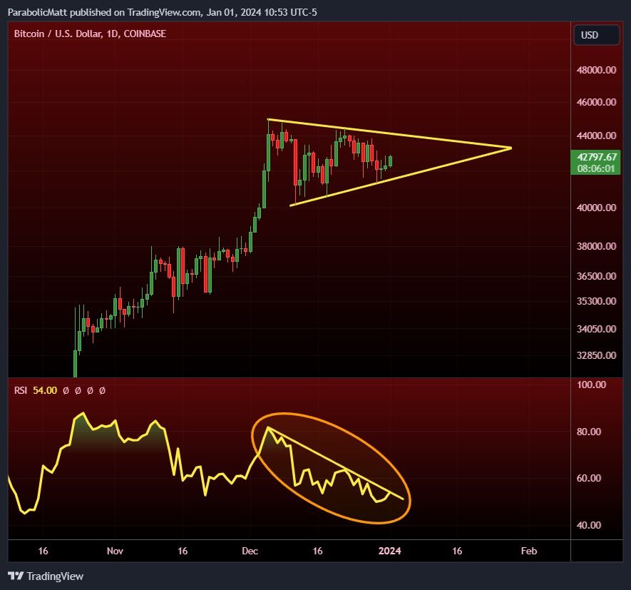 Il a noté : “Le RSI journalier se réinitialise lentement pendant cette phase de consolidation à l’intérieur d’un fanion. Durant cette période, le RSI a également atteint son niveau le plus bas, non observé depuis que le Bitcoin valait 27 000 dollars. La tendance générale est à la hausse, ce qui favorise un mouvement ascendant dans un schéma de continuation, dans lequel se trouve actuellement le BTC.”