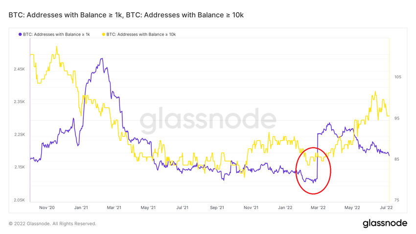 Les données relatives aux grandes adresses sont intéressantes. En effet, alors que les comptes de plus de 1 000 (en violet) et 10 000 BTC (en jaune) ont chuté au début de l’année 2021, ils ont ensuite commencé à augmenter fortement depuis mars 2022 (cercle rouge).