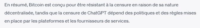 ChatGPT ne partage pas les mêmes caractéristiques que Bitcoin et notamment son aspect décentralisé, élément essentiel de la création de Satoshi Nakamoto. A l’image de d’autres IA, le produit d’OpenAI pourrait plus facilement être censuré par les autorités régulatrices. En effet, puisque différents types de pressions pourraient être exercés soit directement par les gouvernements, soit contre la plateforme.