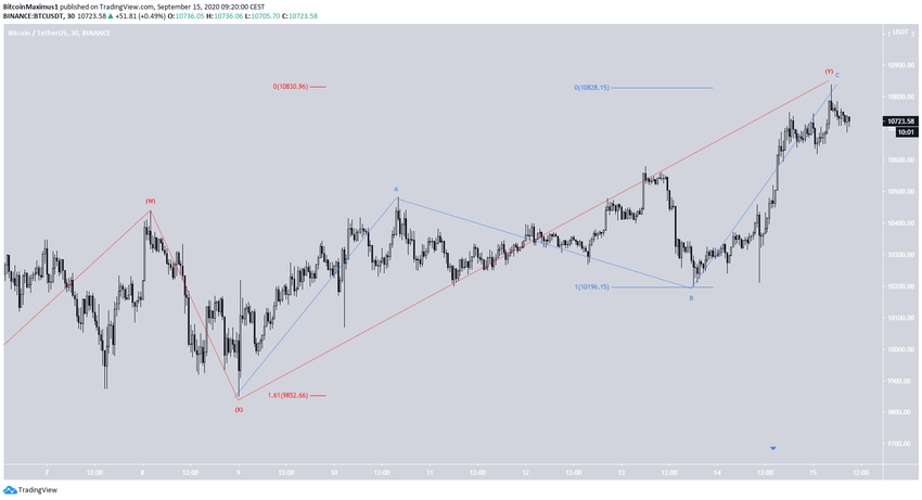 La correction complexe a une structure en W-X-Y (en rouge ci-dessous). Au moment de la mise en page de cet article, le cours avait atteint un sommet à 10 831$, donnant un ratio d’1:1,61 entre la vague W et la vague Y. Il s’agit d’un niveau courant pour ce genre de correction.