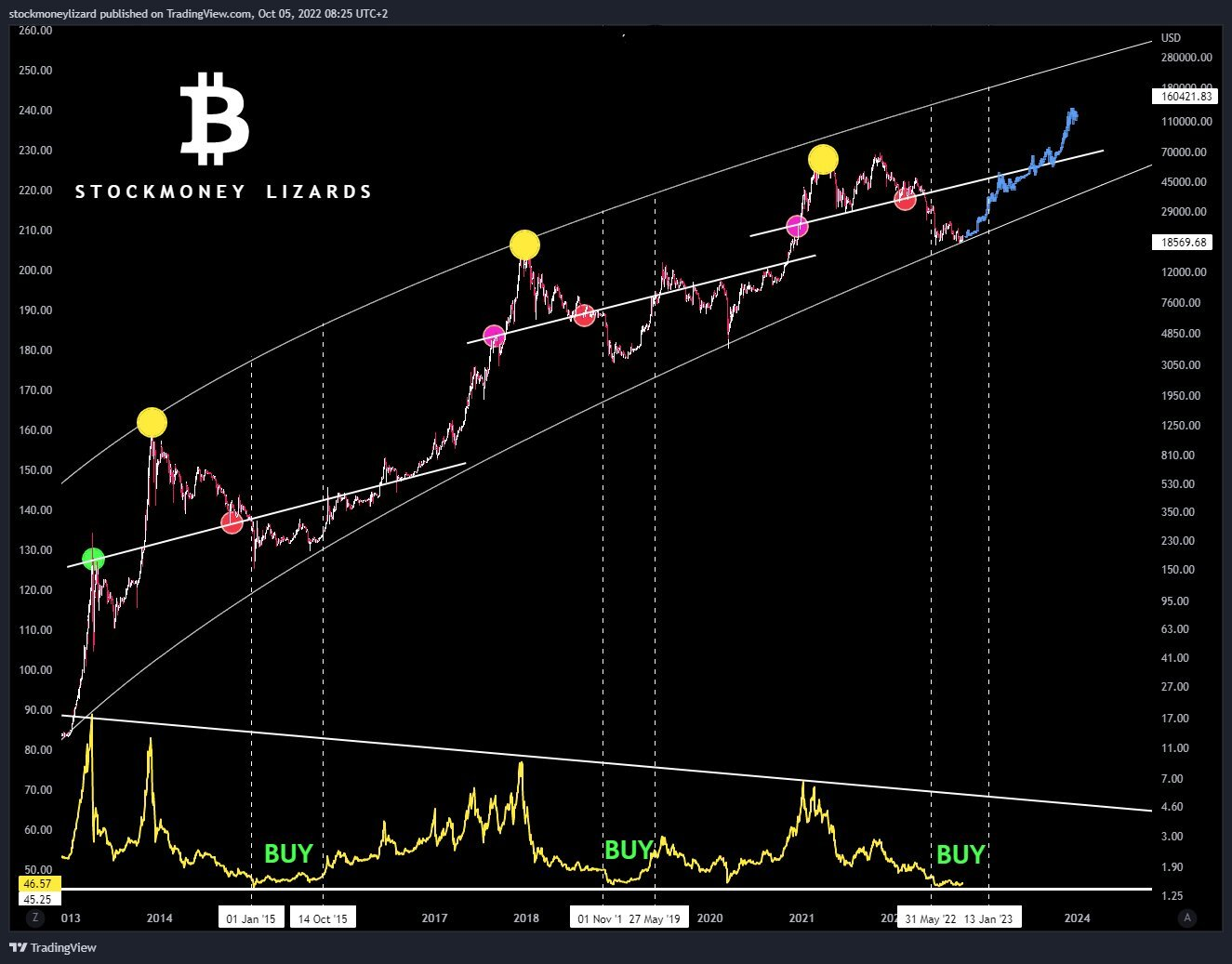 Ce phénomène s’est produit dans les zones marquées ci-dessous (en jaune et en rouge). Il convient de noter que, dans les trois cas, la valeur la plus basse du RSI a été observée en juin 2022. Cependant, l’indicateur, toujours en progression lente, s’est accompagné d’une action latérale du cours de Bitcoin et de plusieurs mois de consolidation. Cela renforce également la thèse d’une reprise du marché haussier au plus tôt durant le premier trimestre 2023.