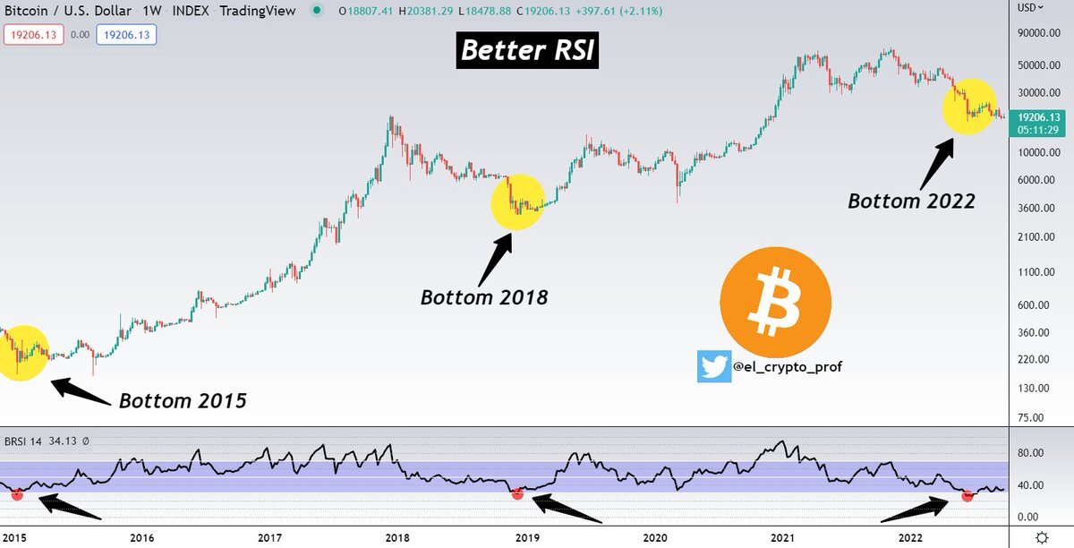 L’indicateur du RSI hebdomadaire, et dont l’interprétation a été tweetée par le même analyste, fournit un autre signal. Selon l’analyste, le passage du RSI hebdomadaire dans la zone de surachat inférieure à 30 indique un plancher du marché.