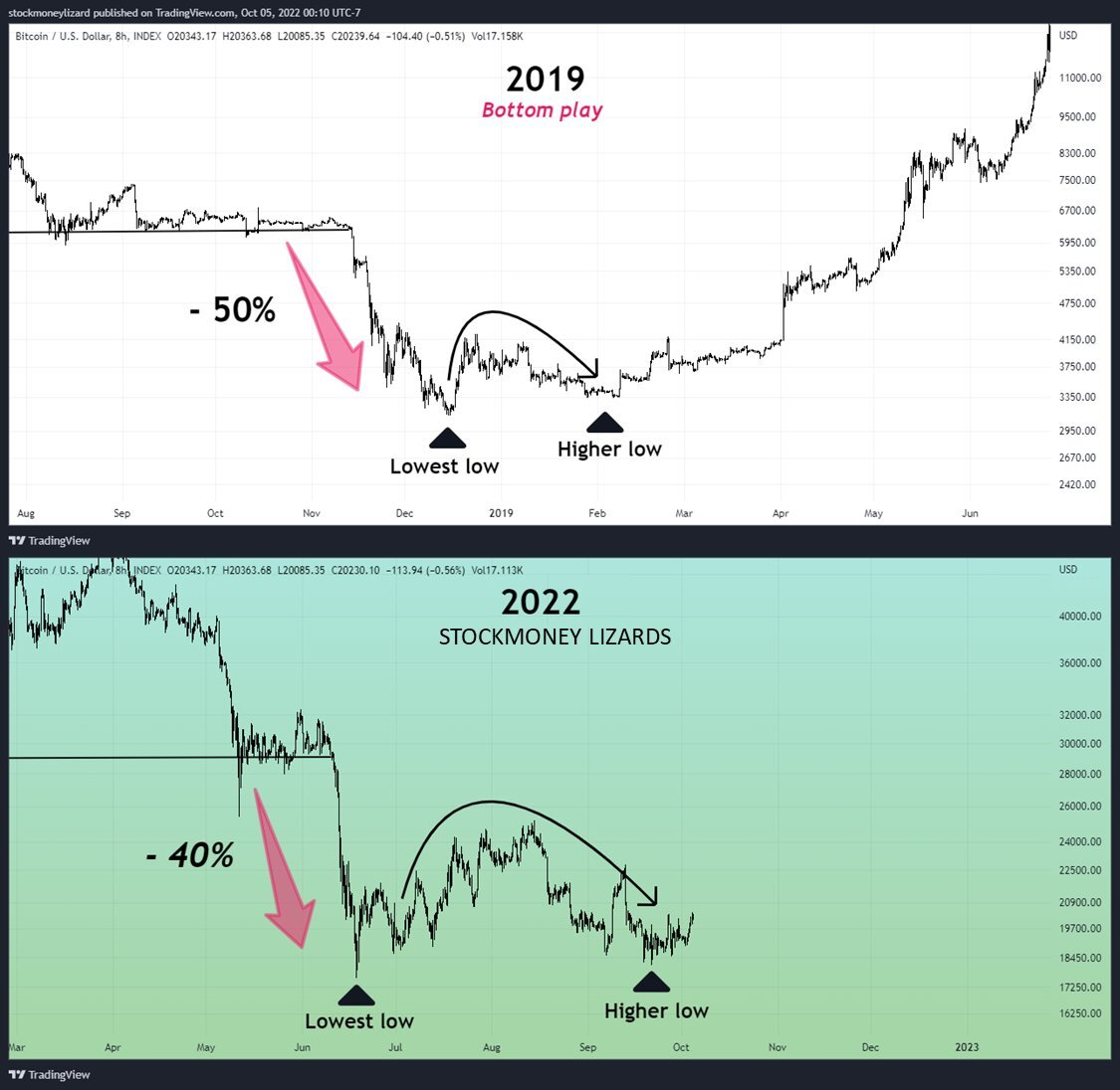 Une autre stratégie possible afin de déterminer la phase du bear martket actuel consiste à essayer de trouver des similarités fractales entre l’action actuelle du cours et le bull market 2018-2019. L’internaute @StockmoneyL a récemment fourni une analyse intéressante à cet égard, en soulignant des parallèles dans la dynamique des 3 derniers cycles.