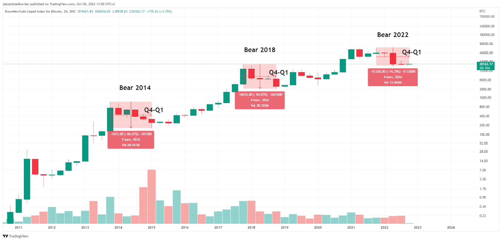 Un examen plus approfondi du graphique logarithmique sur trois mois du BTC confirme les observations de l’analyste. Nous constatons qu’après chaque sommet historique du cours, le marché baissier a persisté pendant plusieurs trimestres. De plus, il a généralement atteint un plancher absolu environ un an après le sommet, entre la fin du quatrième trimestre et le début du premier trimestre.