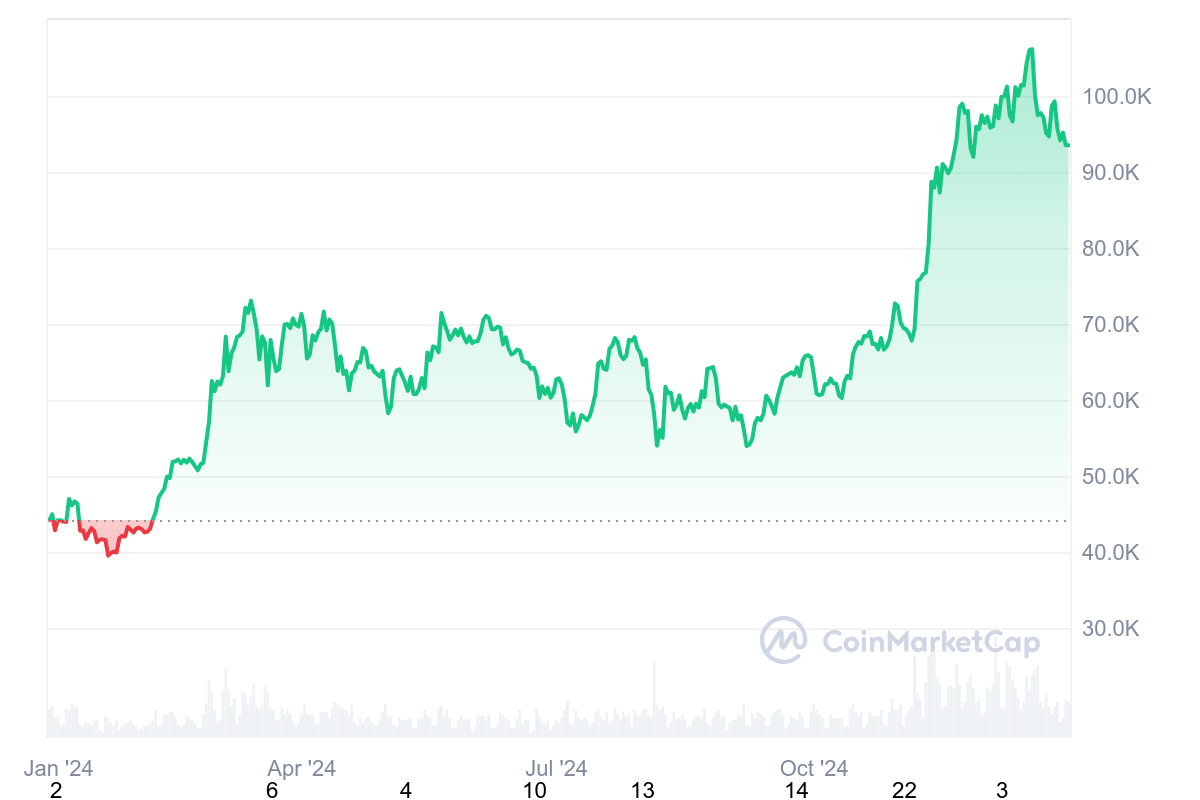 Le Bitcoin a enregistré une hausse de 125,38 % en 2024, clôturant l’année au-dessus des 93 500 $. Si l’on prend en compte son ATH de 108 000 $, la croissance atteint 144,34 %. Cette performance impressionnante a permis à tout le marché des cryptomonnaies de reprendre de l’élan, portant la capitalisation totale au-delà de 3 000 milliards de dollars, un niveau qui n’avait pas été atteint depuis le bull run de 2021.