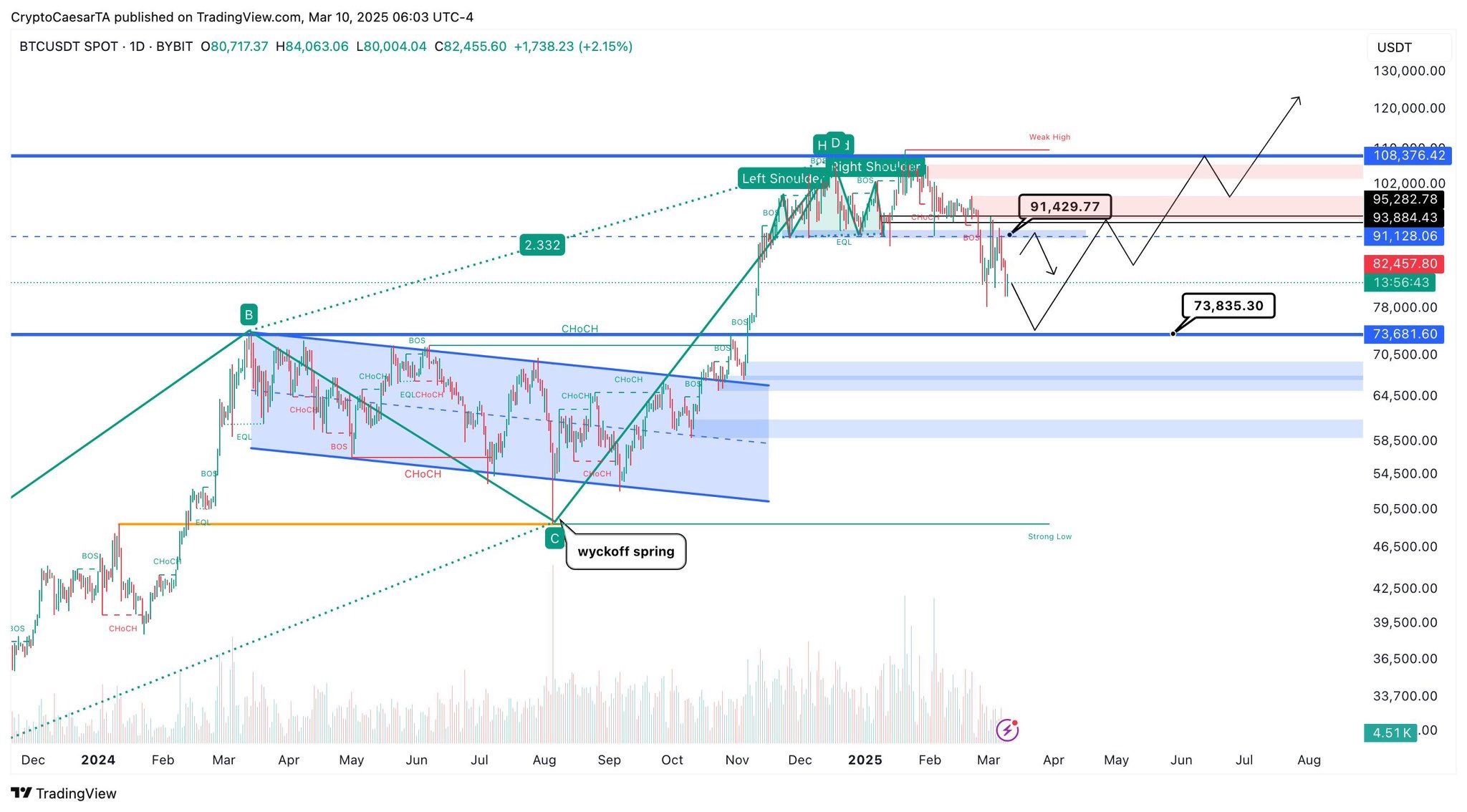 SponsoredCrypto Caesar identifie une structure en tête-épaules, formation classiquement associée à un renversement baissier imminent. Il met en garde contre un potentiel repli vers 73 835,30 $, un niveau de support clé ayant déjà servi de zone de réaction par le passé. Selon lui, une phase de consolidation autour de ce seuil pourrait précéder un éventuel retour de la dynamique haussière.