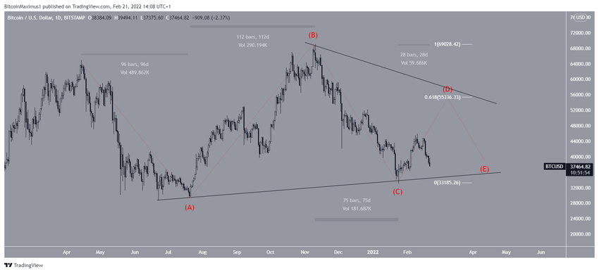 Au sein de ce décompte, le cours de Bitcoin serait actuellement dans son déclin final de vague C.