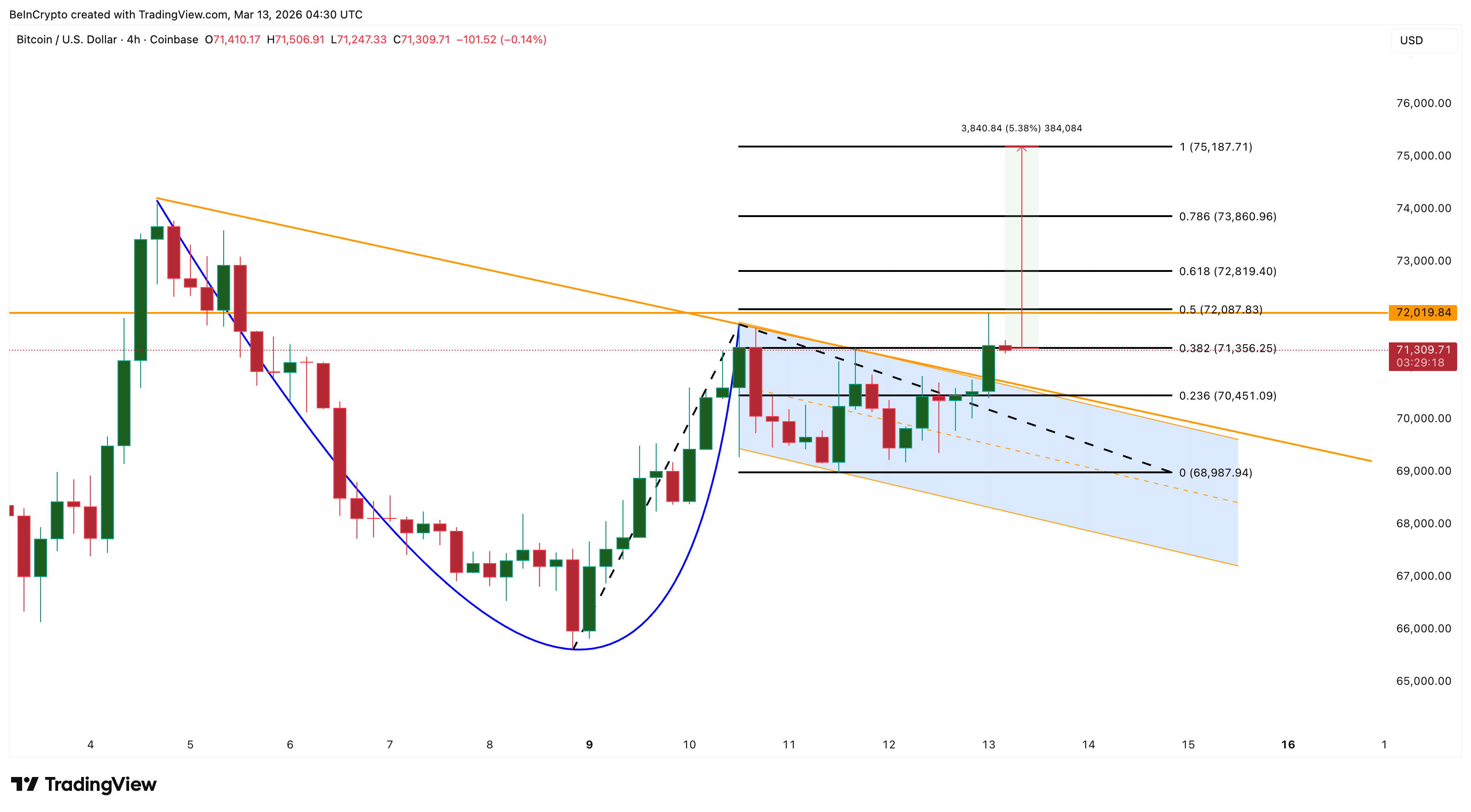 Sur 24 heures, le cours du BTC grimpe de 2,6%, effleurant les 72 000 $ avant de buter sur une résistance. Le graphique en 4 heures dessine un modèle de tasse et anse, mais une divergence baissière sur le RSI évoque un piège haussier.