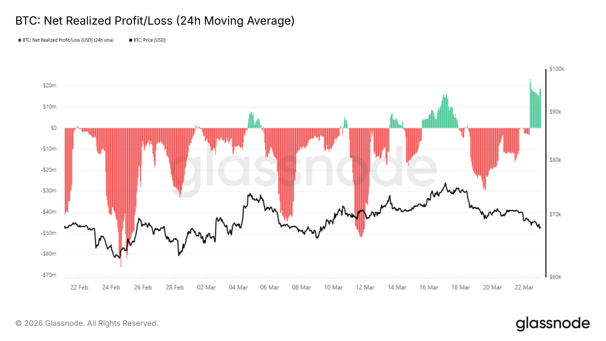 Malgré un rebond impressionnant depuis les 64 000 $, la dynamique reste fragile. Le seuil des 65 000 $ agit comme un plancher psychologique, mais la demande s’y montre moins vigoureuse. Les données on-chain soulignent d’ailleurs une hausse des prises de bénéfices : les profits réalisés ont atteint 23,4 millions de dollars par heure le 22 mars, signe que les investisseurs vendent davantage qu’ils n’accumulent.