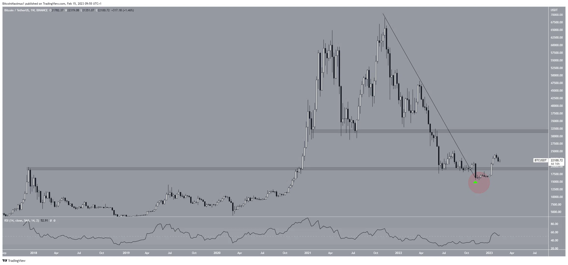Les perspectives hebdomadaires pour Bitcoin sont clairement haussières, ce pour plusieurs raisons. Tout d’abord, le cours a dépassé une ligne de résistance descendante de long terme. Cette dernière était en place depuis son sommet record (ATH). Il l’a ensuite validée en tant que support (flèche verte).