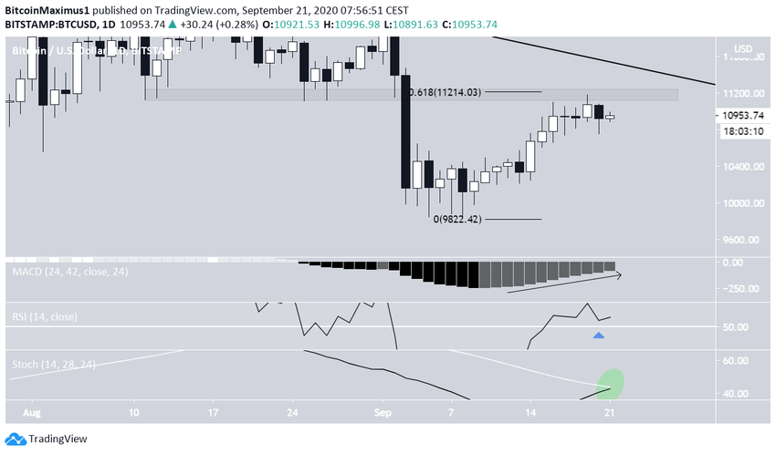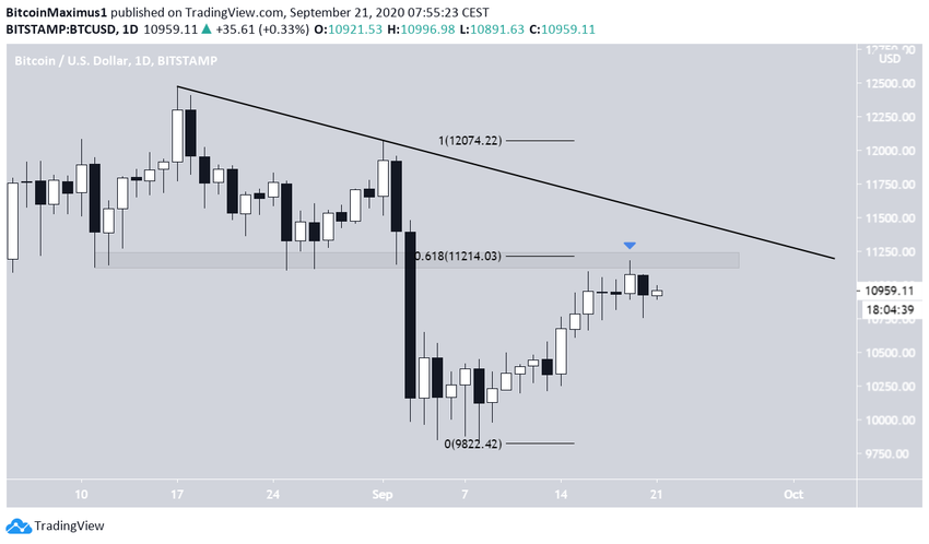 Ce graphique journalier montre que la hausse susmentionnée a pris fin au niveau fibonacci 0,618 de l’entier mouvement descendant à 11,214$. Cela dit, il ne s’agissait pas d’un fort rejet, et le BTC semble se préparer à une nouvelle tentative de dépasser cette zone.
