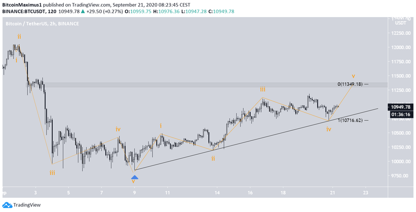Un possible objectif pour le sommet de cette vague serait à 11 350$, une précédente zone de résistance. De plus, si le cours atteignait ce sommet, les vagues 5 et 1 auraient un ratio d’1:1. Il s’agit de la norme lorsque la vague 3 est étendue.