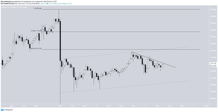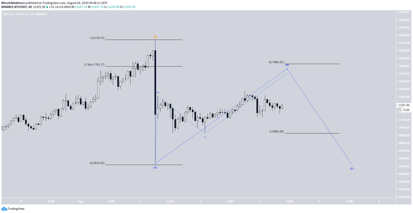 Au niveau du décompte des vagues, il est probable que le cours ait démarré une correction en A-B-C le 2 août. Il aurait immédiatement complété la vague A avec un creux à 10 518$. Le BTC se trouverait maintenant dans la vague B, laquelle apparaît au sein d’une formation en W-X-Y.