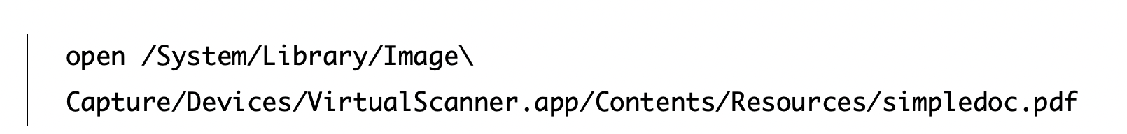 “(Si vous n’êtes pas à l’aise avec Terminal, ouvrez le Finder et cliquez sur Macintosh HD. Ensuite, ouvrez le dossier Système→Bibliothèque→Capture d’images→Périphériques. Faites un contrôle clic sur VirtualScanner.app et sur Show Package Contents. Enfin, ouvrez le dossier Contents→Resources à l’intérieur, puis ouvrez simpledoc.pdf).”