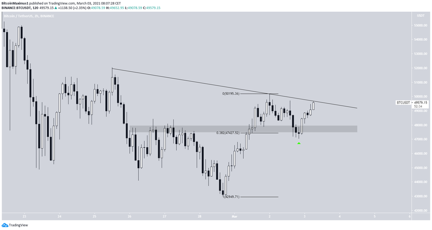 Le graphique sur deux heures montre que le BTC a converti la zone des 47 500$ en support, et se trouve actuellement en train de dépasser une ligne de résistance descendante de court terme. Avec ce mouvement, le cours pourrait ainsi remonter à sa zone de résistance susmentionnée.