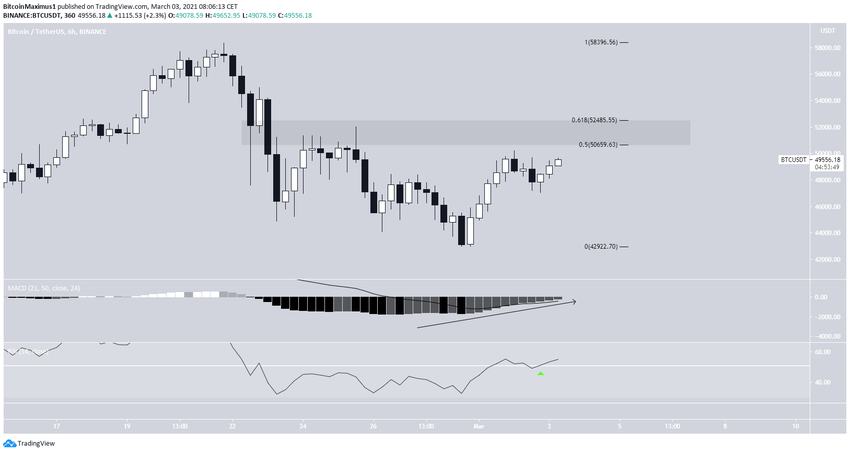 Le graphique sur six heures montre que le BTC s’approche de la principale zone de résistance située entre 50 650$ et 52 450$. Cette zone a été créée par les niveaux de retracement fibonacci 0,5 et 0,618, mesurés à partir du dernier mouvement baissier en date.