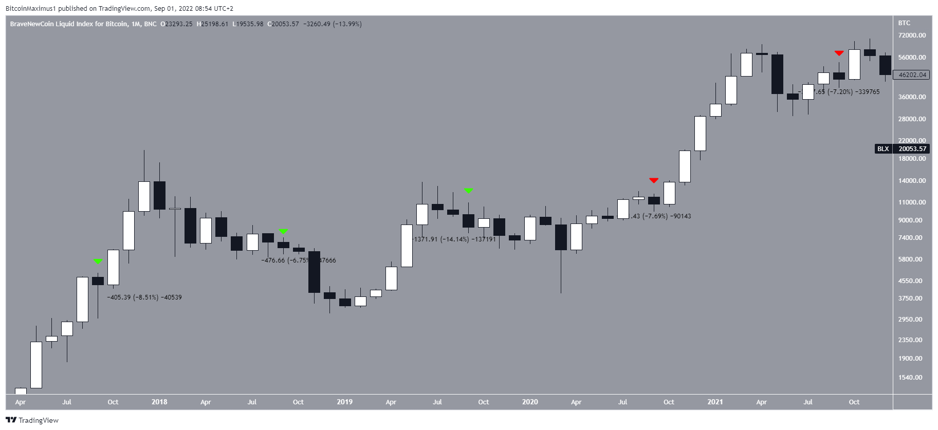 Au niveau de l’historique du cours, le mois de septembre est généralement baissier pour le BTC. En septembre 2020 et 2021 (flèches rouges), le cours a diminué d’un peu plus de 7 %.
