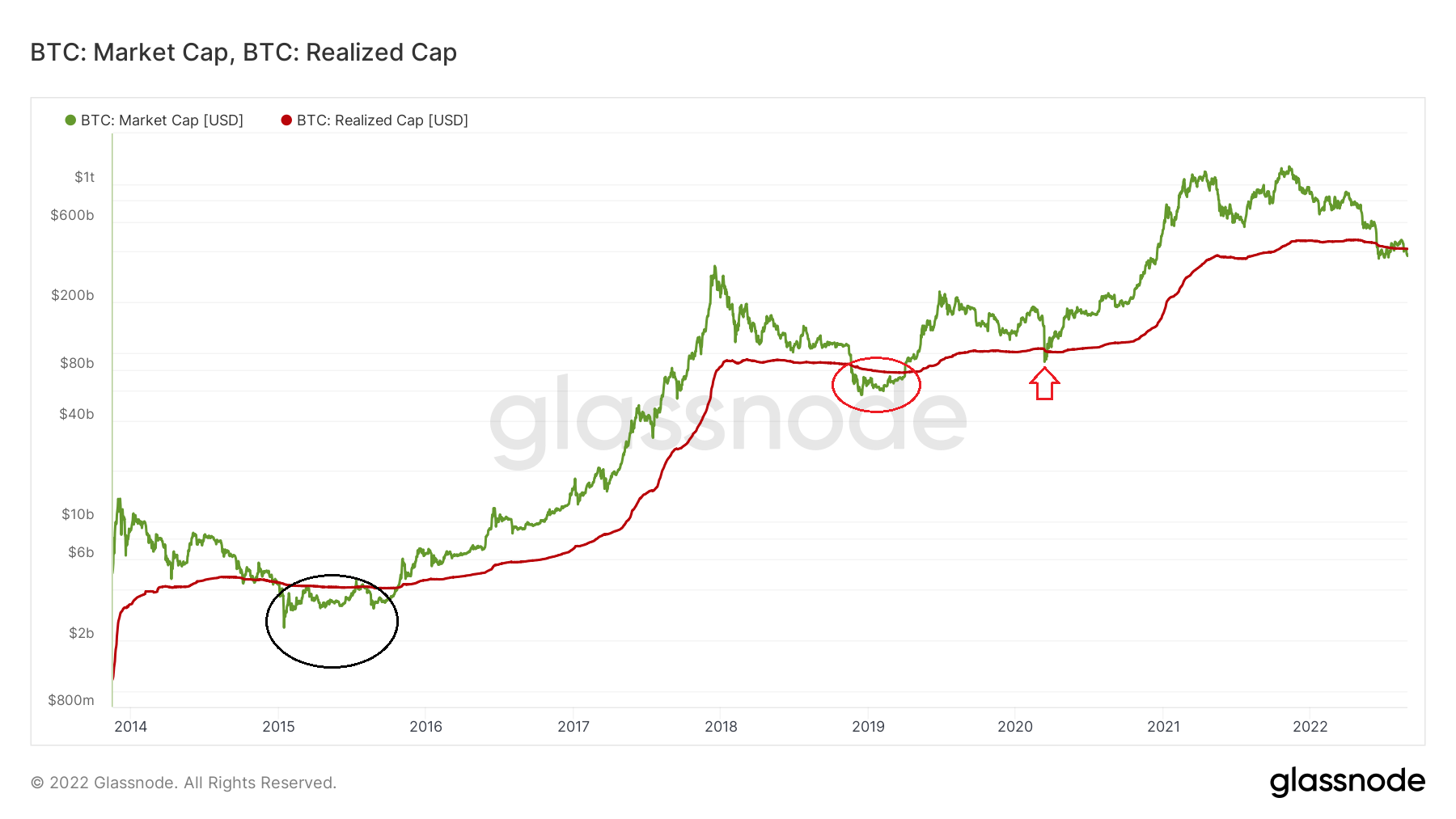 On retrouve également les perspectives baissières de Bitcoin en septembre dans les données on-chain, plus précisément la capitalisation boursière (MC de l’anglais market cap) et la capitalisation réalisée (RC de l’anglais realized cap).