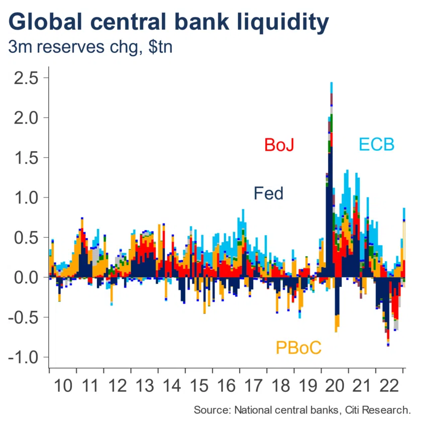 Sponsored SponsoredDepuis octobre 2022, les banques centrales ont ajouté 1 billion de dollars de liquidités nettes sur le marché. Une partie de ces liquidités trouvera son chemin vers le marché crypto. Ce, malgré les efforts de l’administration américaine pour empêcher l’afflux des capitaux vers le marché des actifs numériques.