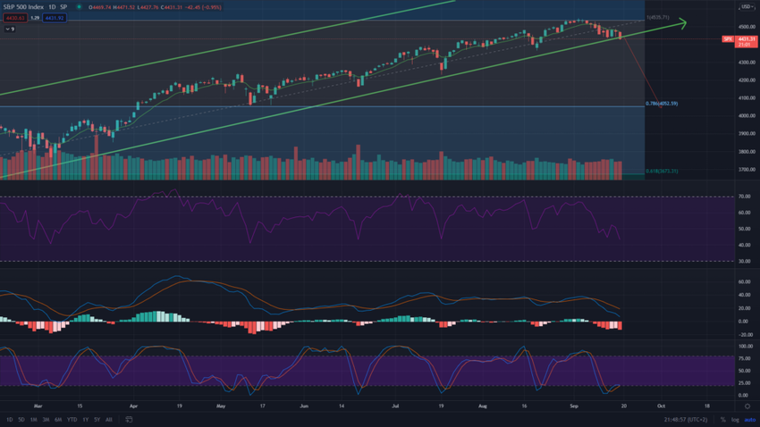 SponsoredAu niveau du graphique journalier du 18 septembre, on voit que le cours se situait à la ligne de support susmentionnée. S’il passe sous cette ligne, alors une phase de correction sera probablement observée en premier lieu. Le RSI est tombé en dessous de 50, et la MACD comme l’oscillateur stochastique pourraient continuer à décliner. Ainsi, il est fort probable que le SP 500 chute bientôt en dessous de sa ligne de support. Dans ce cas, nous pourrions également observer une correction au moins à court terme (de 10 à 20%) du cours de Bitcoin.