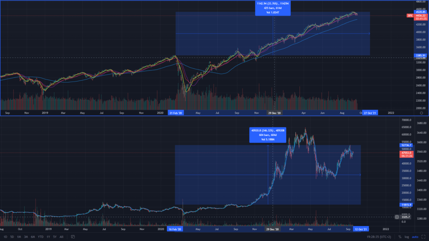 C’est l’une des principales raisons pour lesquelles le SP 500 comme le cours de Bitcoin ont fortement augmenté. Toutefois, le BTC a été en mesure de surpasser le SP 500 de manière considérable (3456% contre 30%). L’augmentation nominale de la valeur du SP 500 correspond donc approximativement au taux d’inflation ou à l’augmentation de la masse monétaire.