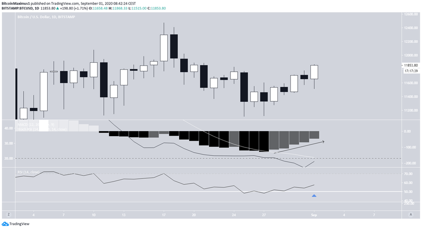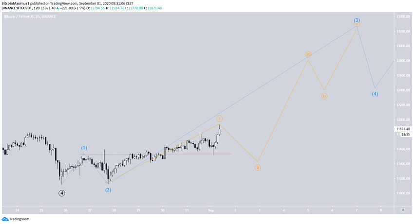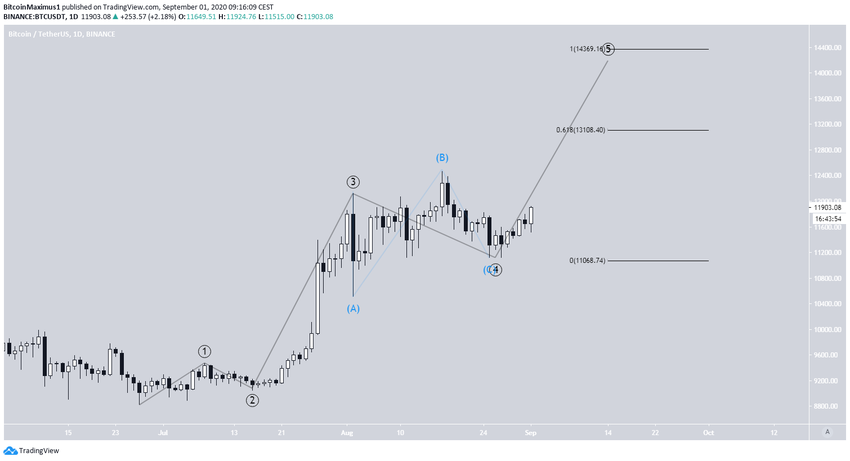 Comme souligné dans le décompte de vagues de l’analyse du 30 août de BeInCrypto, le passage de la zone des 11 825$ (ligne rouge dans le graphique ci-dessous) annulerait le décompte baissier. Le cours de Bitcoin a ainsi passé cette zone le 31 août. Il est donc probable que la vague 4 (en noir) ait pris fin et que le cours soit maintenant dans la vague 5.