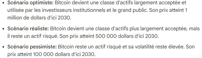 Etant donné la difficulté d’établir une différence de prix entre un BTC boosté par un ETF et un autre qui ne connait pas ce phénomène, c’est à l’IA Google Bard que nous avons fait appel. Pour répondre à la question, l’intelligence artificielle a spéculer sur le prix que pourrait atteindre Bitcoin en 2023, 2025 et 2030.