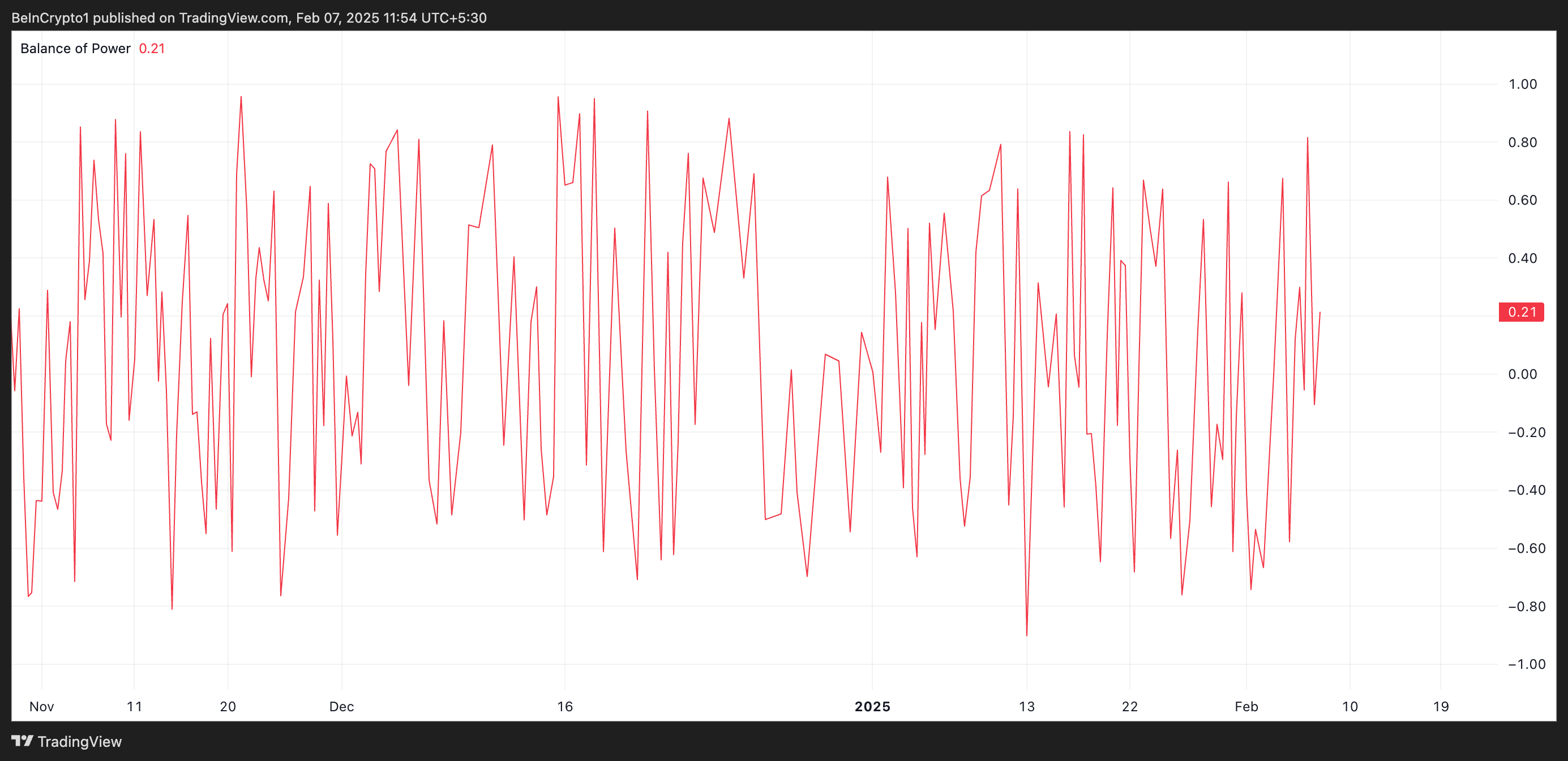 SponsoredPour rappel, le BoP d’un actif mesure la force de ses acheteurs par rapport aux vendeurs en analysant les mouvements de cours sur une période donnée. Ainsi, lorsque la valeur de cet indicateur est positive, les acheteurs ont la main sur le marché, signalant une forte pression d’achat et une potentielle poursuite de la tendance haussière de l’actif.