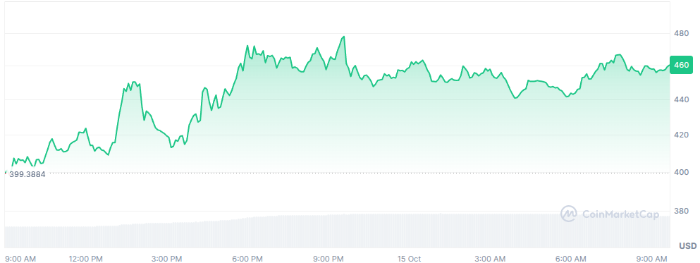 Le TAO se négocie autour de 460 $, en hausse de 14 % sur la journée. Cette progression, déjà impressionnante, place le jeton au-dessus de ses moyennes mobiles à 20, 50 et 200 jours, confirmant un momentum positif sur tous les horizons temporels.